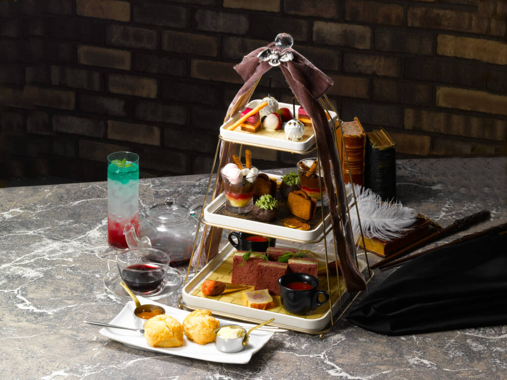 スイーツとセイボリーを組み合わせた華やかな3段スタンドには、ミニヘドウィグケーキやワンドチュロス、大鍋シュークリームなど、魔法界を思わせる遊び心のあるメニューが並びます。