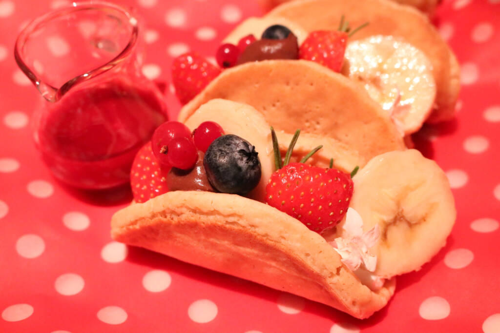 優しい甘さのオートミールパンケーキは、ラズベリーソースの酸味が良いアクセントに。