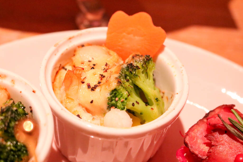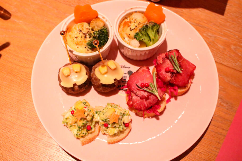 ミッキーのズボンをモチーフにしたハンバーグや、ドナルドをイメージしたシーフードグラタン、クリスマスツリーのような色合いが目を惹くタルティーヌなど、遊び心を残しつつもしっかり食事として満足できるバランス感が魅力的。