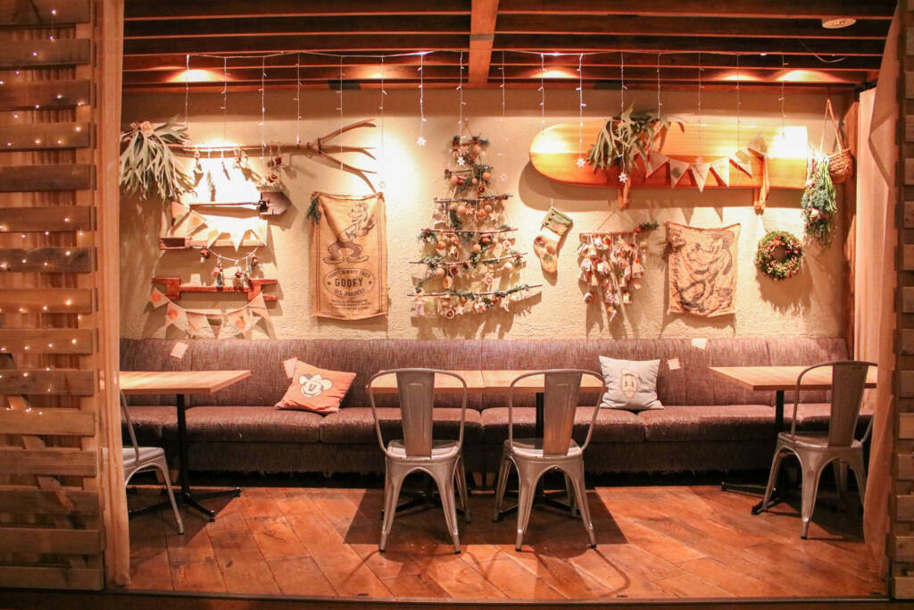 スポーツやレジャーなど、アクティブなシーンで描かれることが多いグーフィーらしく、木の質感や自然を感じる装飾があしらわれた、居心地の良い空間です。