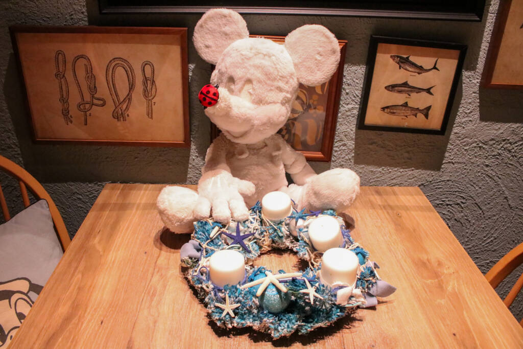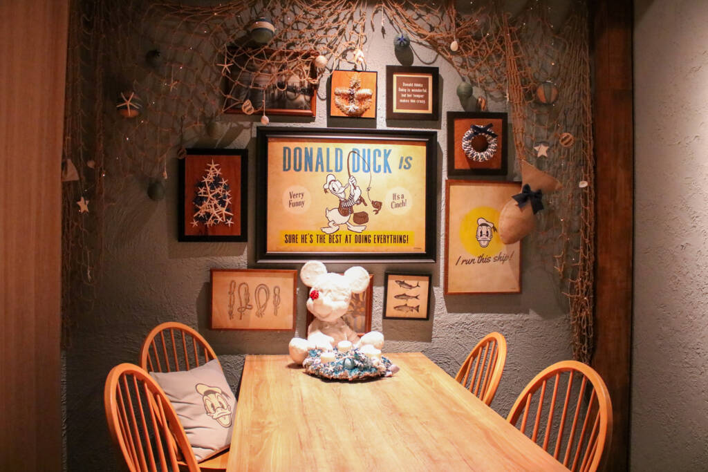 カーテンで仕切れるドナルドルームは、クリスマスカラーの装飾に加えて、釣り具などドナルドらしいモチーフが散りばめられた、ちょっと“イケてる”雰囲気の半個室。
