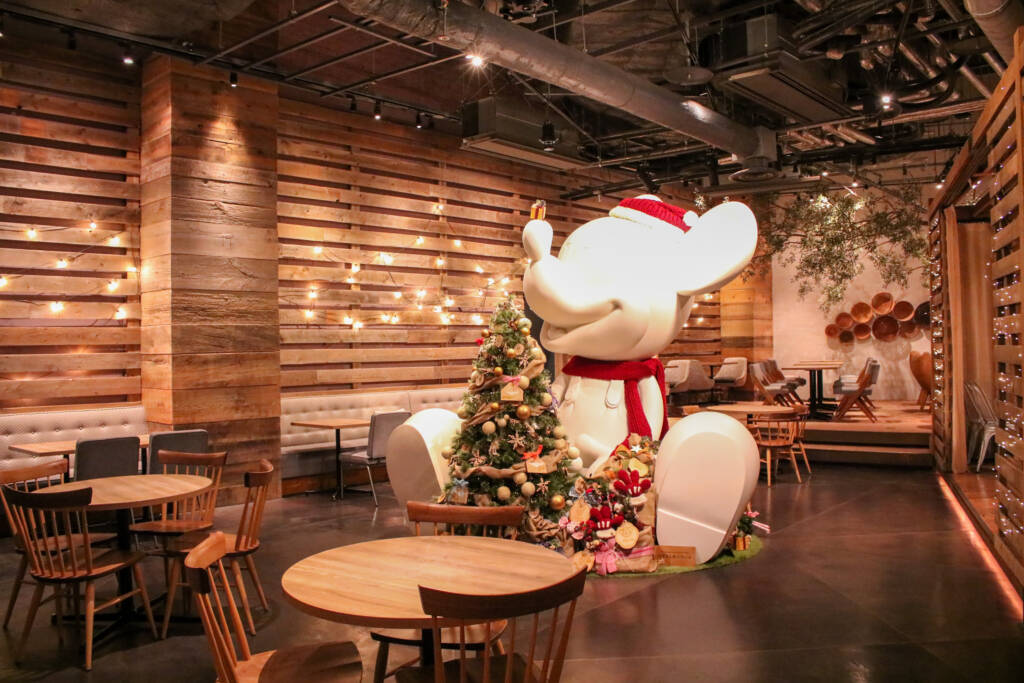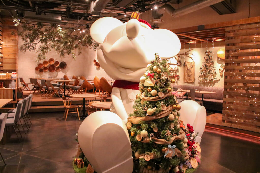 クリスマス仕様の巨大ミッキー像と隠れミッキー盛りだくさんの店内
