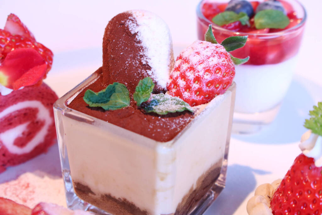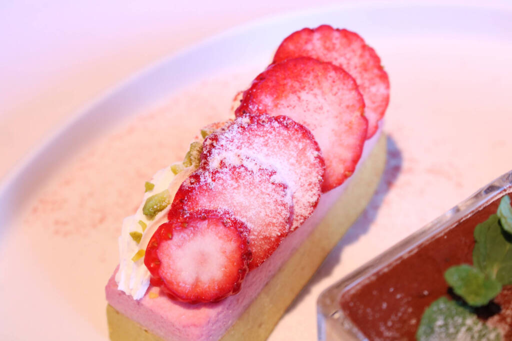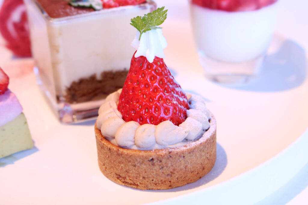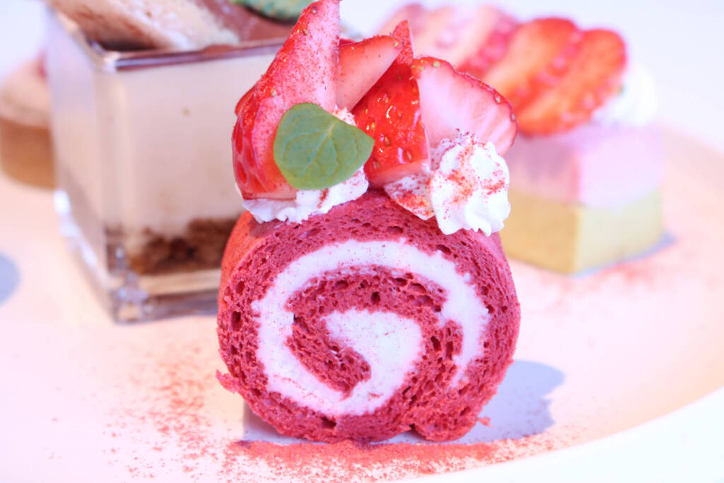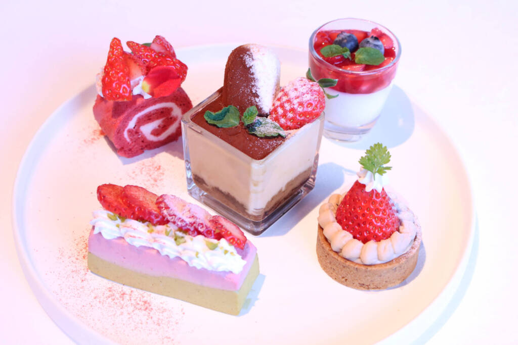 スイーツには、いちごと紅茶のタルトやいちごのロールケーキ、ピスタチオといちごを組み合わせたムースなど、いちごの魅力をさまざまな表情で楽しめるメニューが揃います。