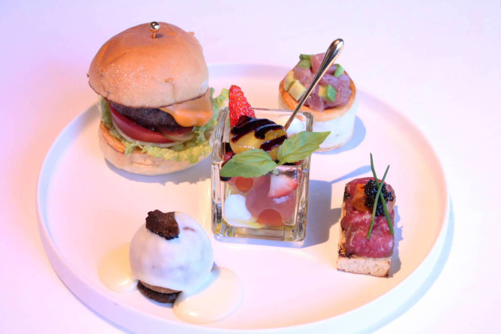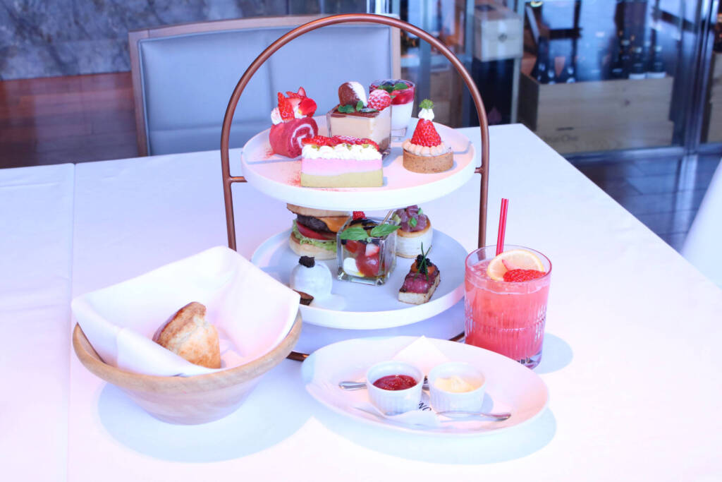 いちごタルトやいちごロールケーキ、ピスタチオと組み合わせたムースなど、見た目にも心ときめくスイーツに加え、USDA PRIME BEEFのミニバーガーやローストビーフなど、甘いだけに終わらない“大人のアフタヌーンティー”に仕上がっています。