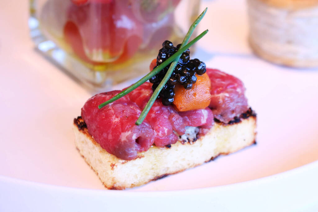 ブリオッシュの上にプライムローストビーフ、濃厚な雲丹、上質なキャビアを重ねた贅沢な一品。